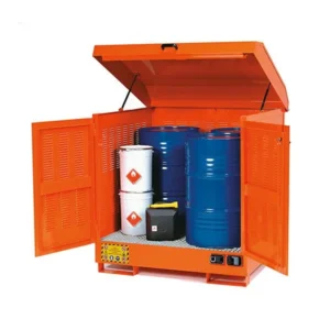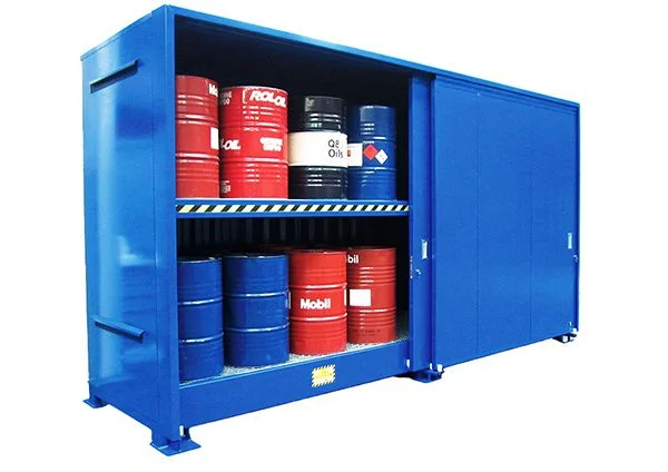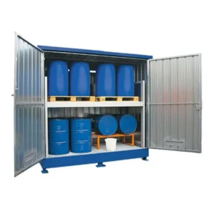 Linea completa di depositi e armadi per lo stoccaggio esterno di fusti. Versioni specifiche per liquidi infiammabili, acidi, pericolosi e inquinanti.