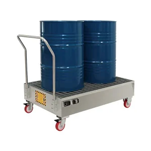 Carrelli per fusti con vasca di raccolta integrata, ideali per la prevenzione dei rischi dovuti a possibili sversamenti accidentali durante le operazioni di movimentazione.