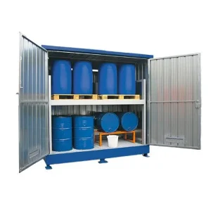 Modul container per lo stoccaggio di fusti e altri contenitori primari più piccoli. La modularità consente una grande flessibilità nella gestione degli spazi e un agevole trasporto con muletto. I modelli standard sono disponibili nelle versioni con porte scorrevoli, a battenti, senza porte, con telo PVC e su 1 o due piani.